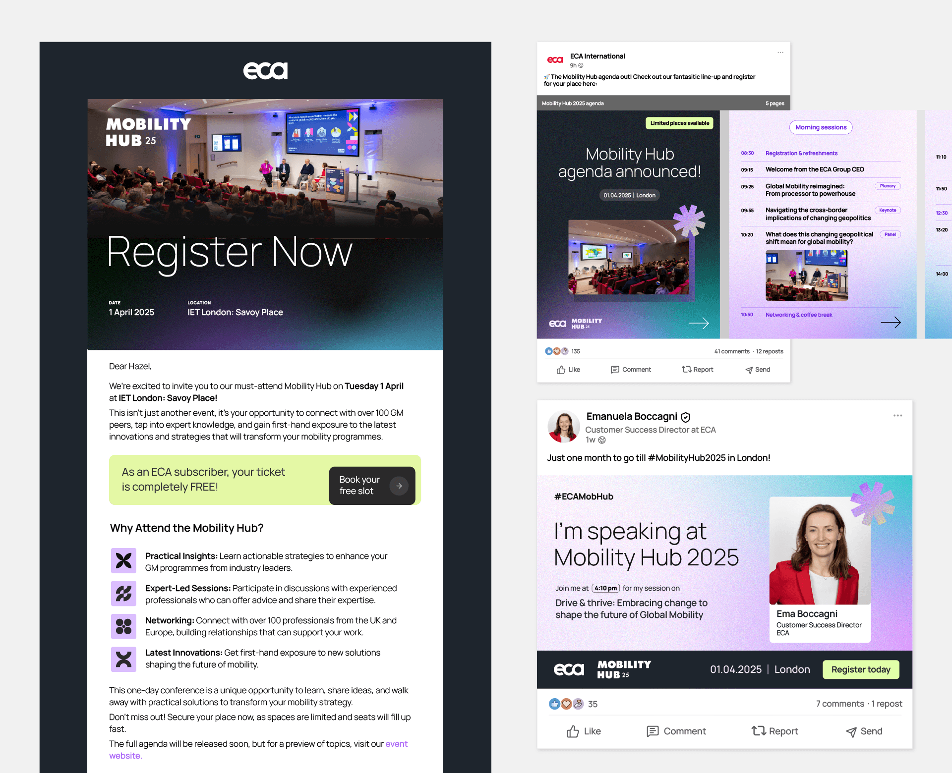 Mobility Hub required a bold new identity to support the launch of ECA’s SaaS platform and establish itself as a leader in global mobility technology. Featuring vivid gradients, striking typography, and dynamic motion, the refreshed branding generated overwhelming enthusiasm from attendees and strong endorsement from the C-suite.